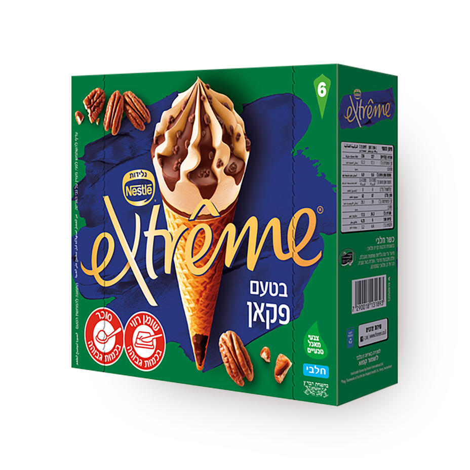 גלידה בשומן צמחי בטעם פקאן עם אגוזי פקאן מסוכרים, בתוספת ופל ואגוזי פקאן מסוכרים מצופים שוקולד חלב