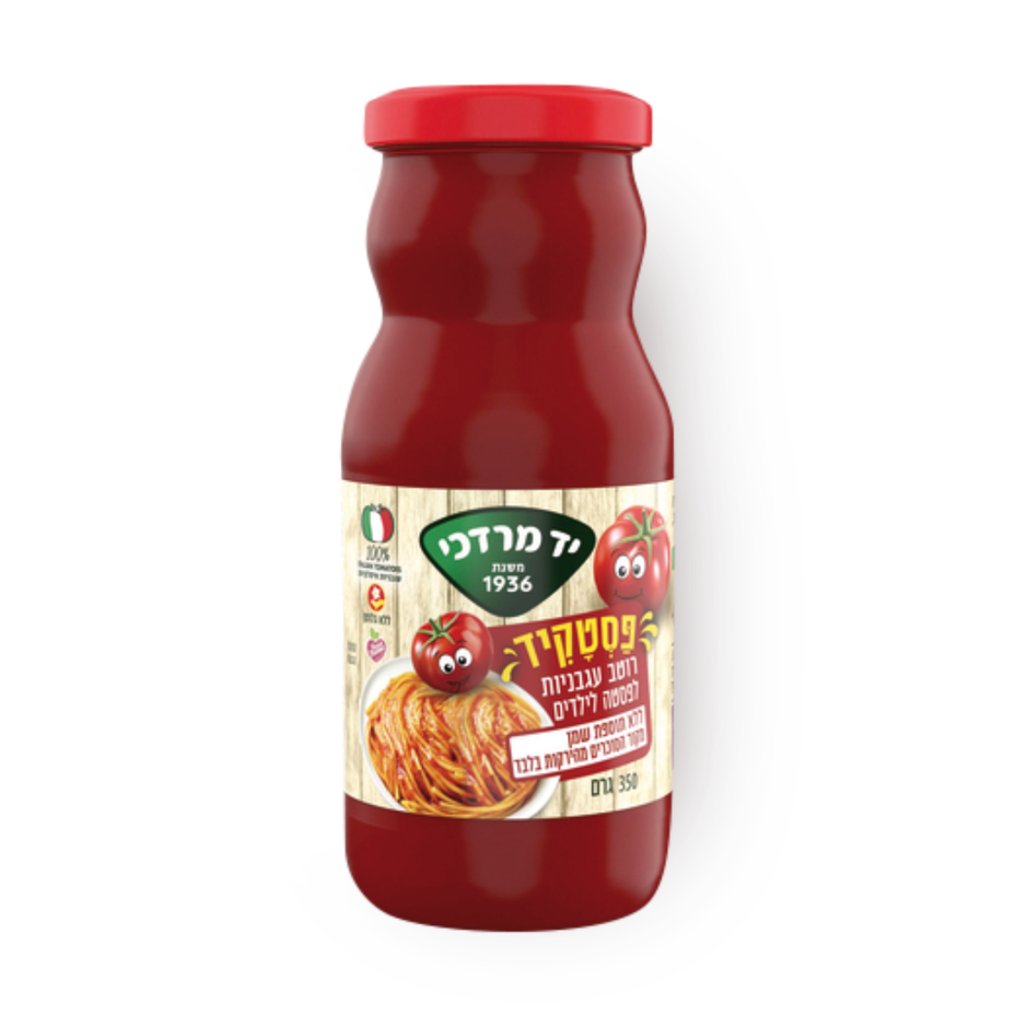 פסטקיד- רוטב עגבניות לפסטה לילדים במירקם חלק, ללא תוספת שמן, מקור הסוכרים מהירקות בלבד.. ללא חומרים משמרים. 100% עגבניות איטלקיות.