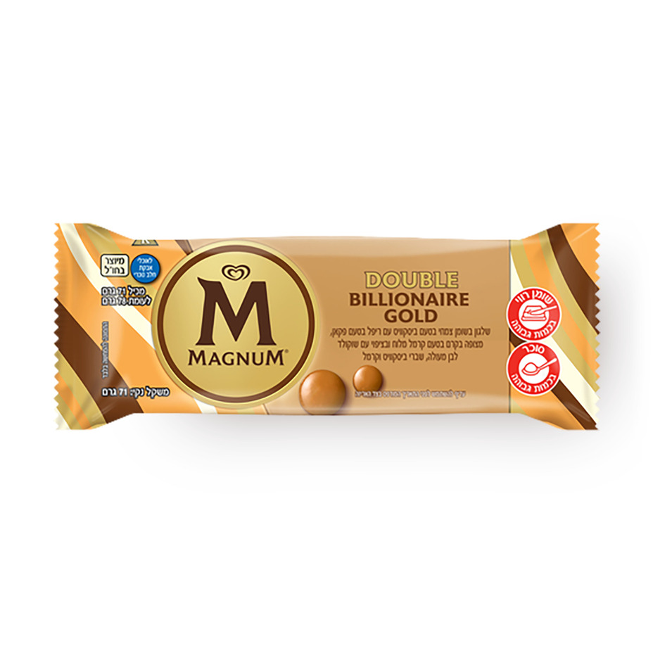 מגנום דאבל ביליונר גולדשלוש שכבות של תענוג: שלגון מפנק בטעם ביסקוויט עם ריפל בטעם פקאן, מצופה בקרם בטעם קרמל מלוח, ובציפוי עם שוקולד לבן מעולה, שברי ביסקוויט וקרמלהנאה מעבר לציפיות.מגנום. להתמסר לתענוג.