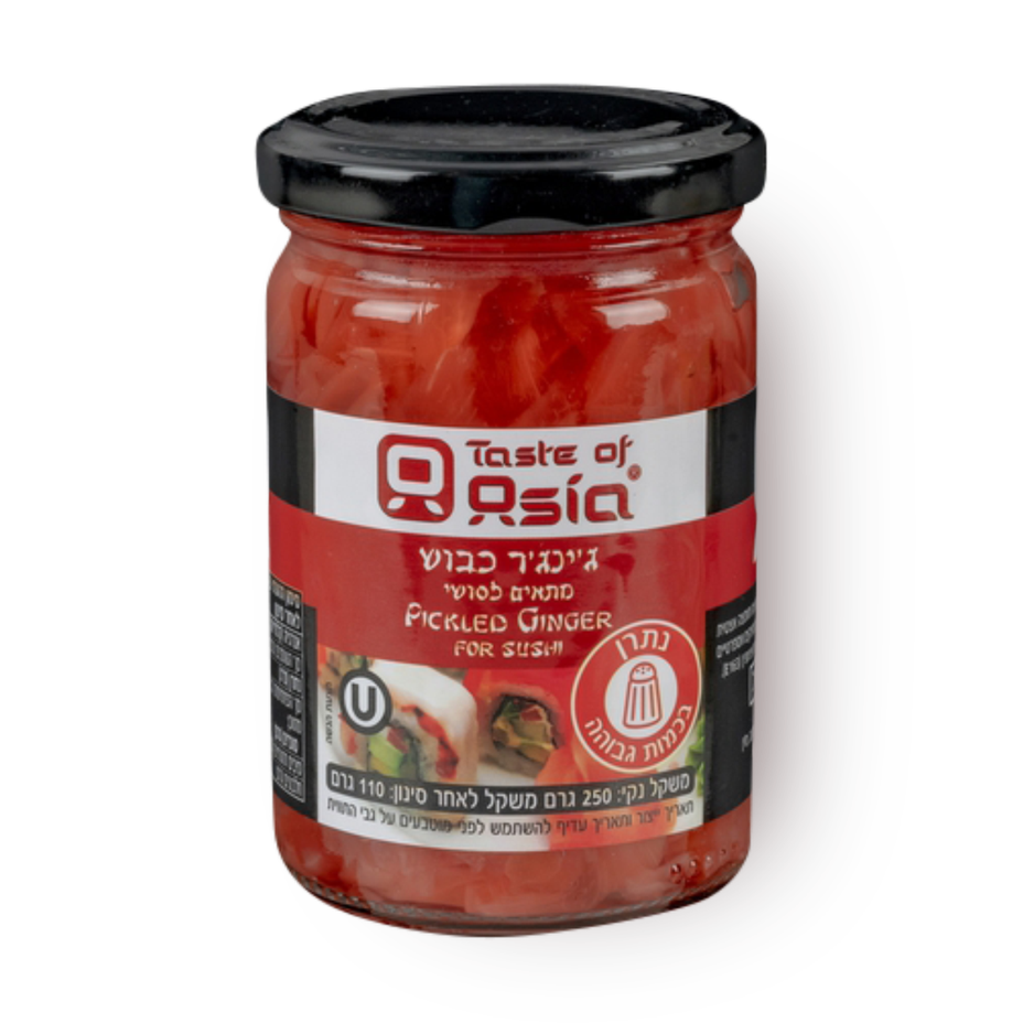פרוסות ג'ינג'ר (זנגביל) 44%, מים, מלח שולחן, מווסתי חומציות חומצה אצטית (E260), וחומצה צטרית (E330), חומר משמר פוטסיום סובאט E202, ממתיקים אספרטיים (E951), סוכרלוז (E955), סודיום סכרין (E954), צבע מאכל טבעי אנתוציאנין E163