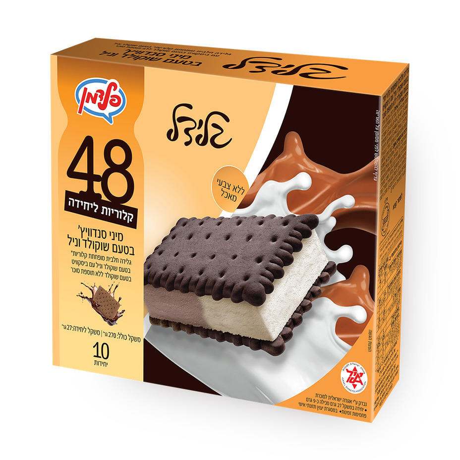 גלידל מיני סנדוויץ' בטעם שוקולד וניל , גלידה חלבית מופחתת קלוריות בטעם שוקולד וניל עם ביסקוויט בטעם שוקולד ללא תוספת סוכר , 48 קלוריות ליחידה