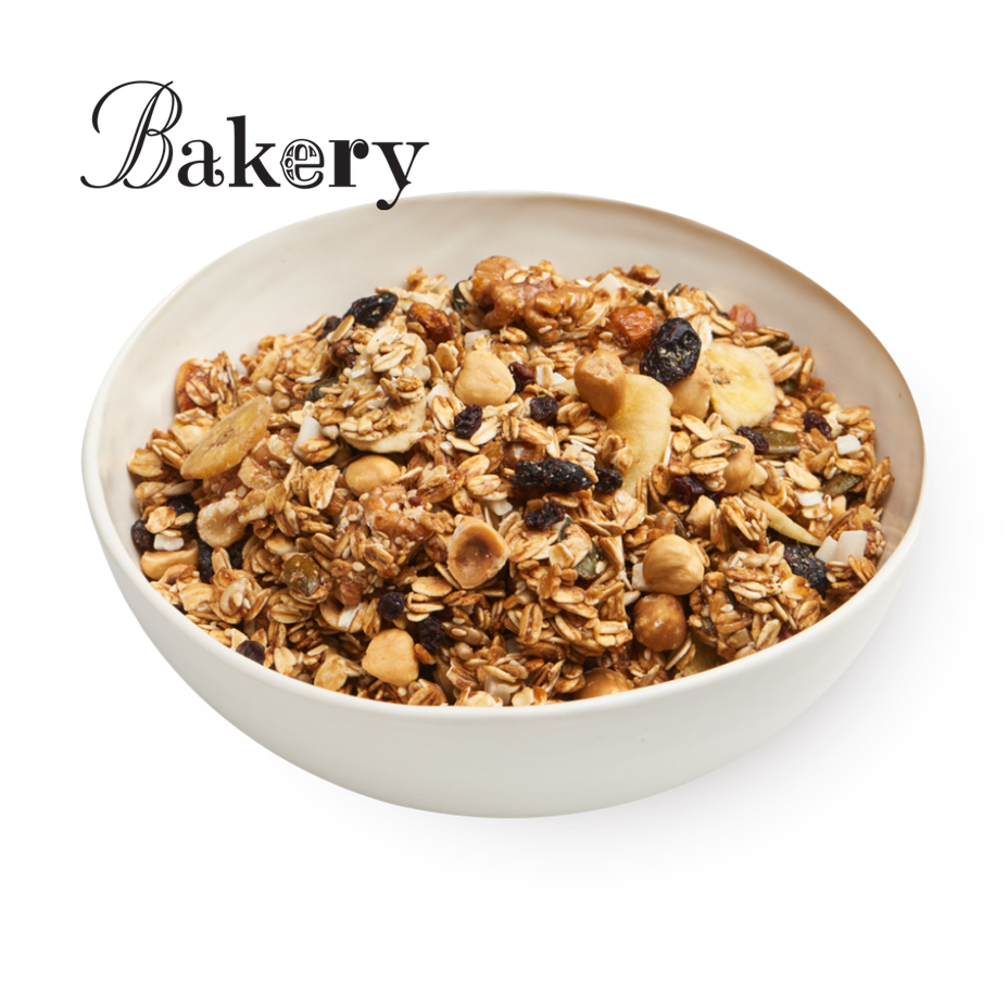 Oats (gluten), date silan, maple syrup, almonds, pumpkin seeds, coconut, hazelnuts, blueberries, banana, dried cranberries, sunflower seeds, pecans, sesame, walnuts, refined canola oil, water.