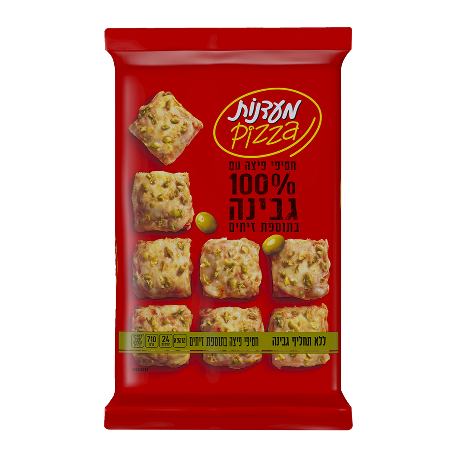 קמח חיטה (מכיל גלוטן חיטה), רוטב פיצה (24%) [מים, תרכיז עגבניות, שמן צמחי, תערובת תיבול לפיצה, עמילן אורז, מלח, חומר משמר (E-202)], גבינה חצי קשה 22% שומן (14%) (מכיל: חומר משמר E-202, צבע מאכל אנאטו), מים, זיתים ירוקים חתוכים (9%), מוצרלה 22% שומן (6%) [(חלב, מלח, מווסת חומציות (חומצת לימון), חומר משמר (E-202)], שמן צמחי, סוכר, שמרים לאפייה, מלח, מונע התגיישות (תאית), קמח סויה, גלוטן חיטה, לתת (מכיל גלוטן שעורה), מחמצת שיפון (מכיל גלוטן שיפון).