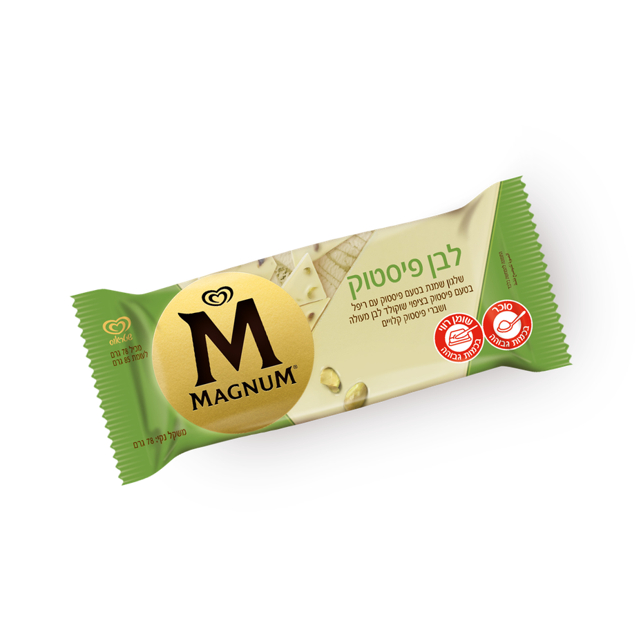גלידת מגנום לבן פיסטוק: שילוב טעים של גלידת שמנת קטיפתית בטעם פיסטוק עם ריפל בטעם פיסטוק וציפוי שוקולד לבן עם שברי פיסטוק קלויים