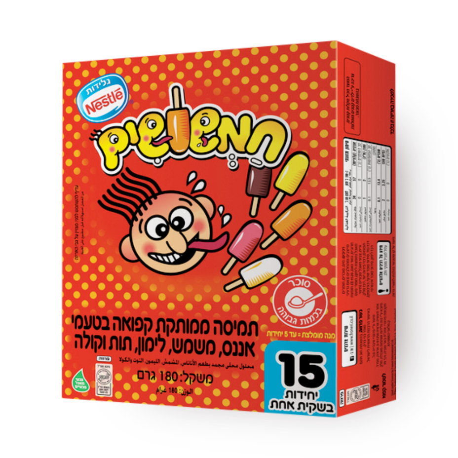 15 יחידות קרחוני שרבט פרווה בטעמי אננס, משמש, לימון, תות וקולה. כל קרחון 12 גרם.