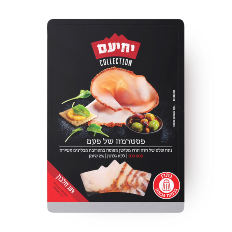 יחיעם, פסטרמה של פעם,עשוי מנתח שלם של חזה הודו מצופה בתערובת תבלינים עשירה. אפוי, מעושן באופן מסורתי ופרוס, ללא תוספת מונוסודיום גלוטומט, ללא גלוטן 200 גרם