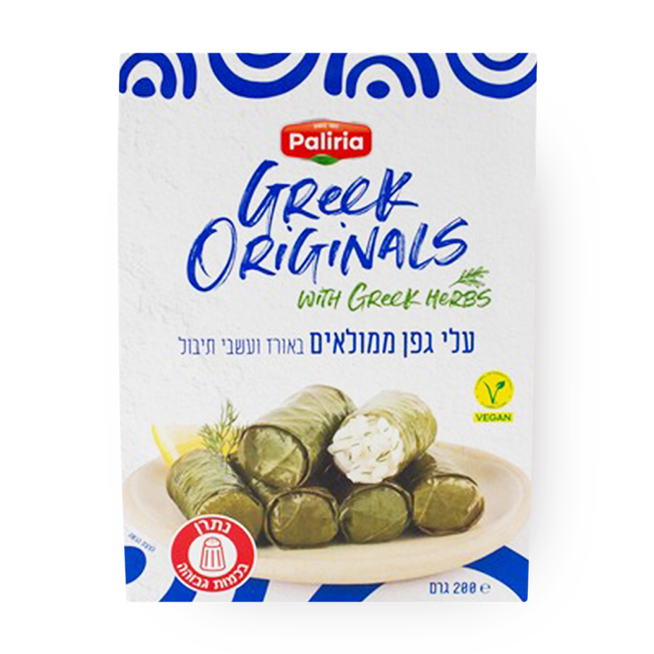 אורז מבושל 60%, מים, עלי גפן 10%, שמן סויה, בצל, שמיר, מיץ לימון מרוכז, עלי מנטה, מלח, מיצוי טבעי מירקות ותבלינים, פלפל שחור