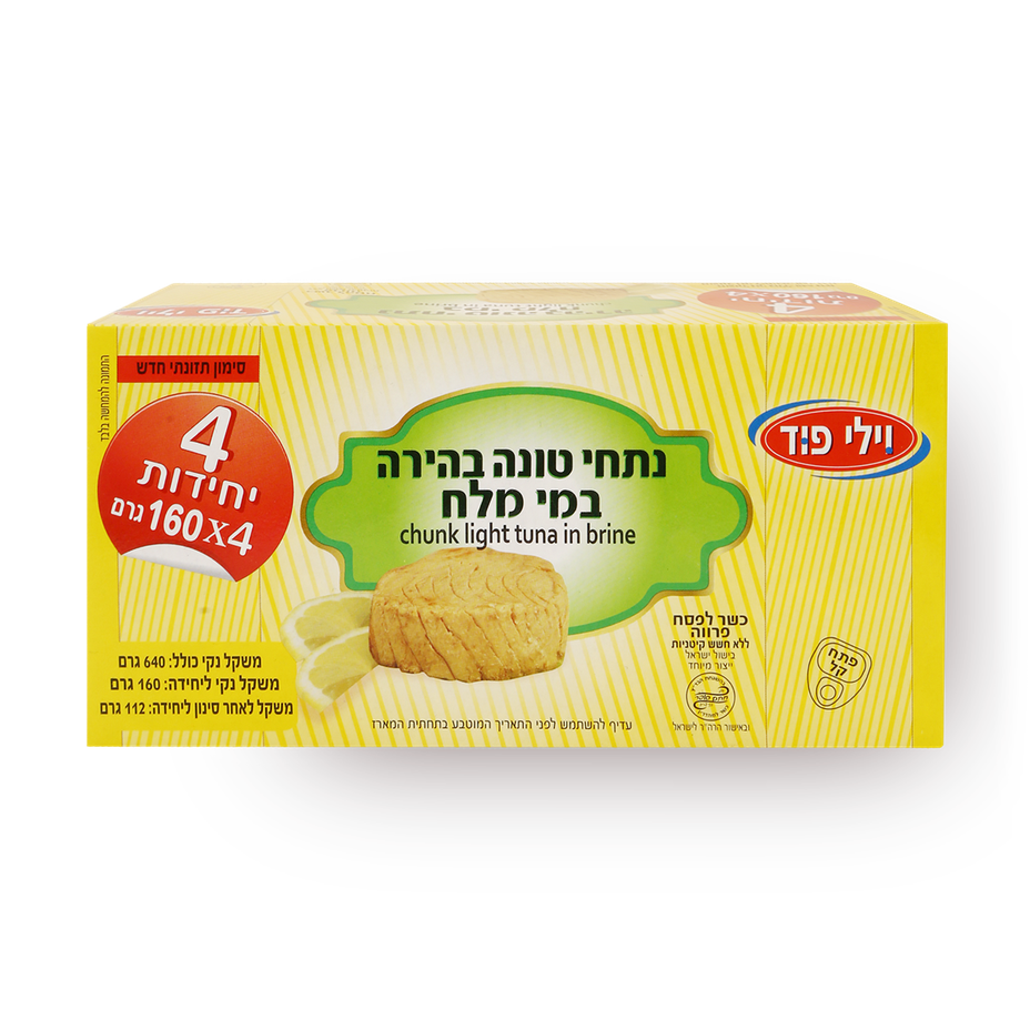 22.5 ₪רכיבים שתויגו: נתרן בכמות גבוהה, כשר11.25 ₪ – 100 ג' - מארז נתחי טונה בהירה בשמן צמחי4 × 160 ג'