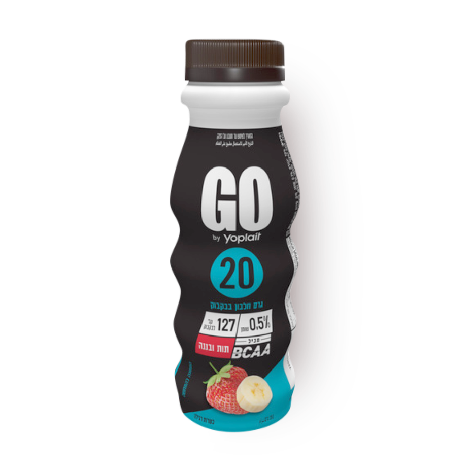 72% יוגורט 0.7% שומן, מים, פירות מבושלים( 6%)(תות( 3%) , בננה( 3%)), חלבוני חלב( 6%) , מייצבים( פקטין, קרגינן) , עמילן מעובד( E1442) , צבע מאכל( רכז גזר שחור) , חומרי טעם וריח, מווסת חומציות( חומצת לימון) , ממתיקים( אספרטם, אססולפאם קיי) , חומר משמר( E202) . בתוספת חיידקי ביפידוס. 20 גרם חלבון בבקבוק , מתוכם 16 גרם חלבוני מי גבינה, 4 גרם קזאינים .
